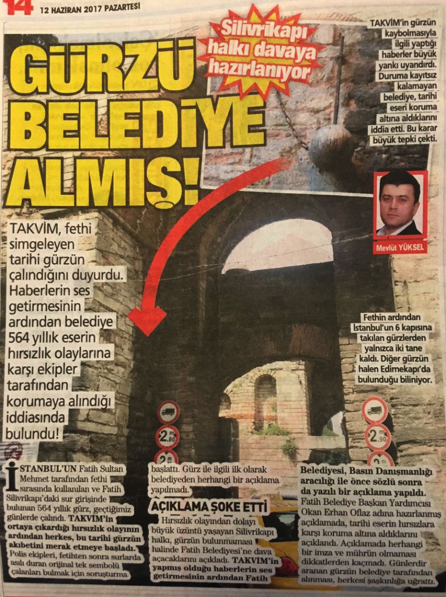 Silivrikapıdaki Fethin sembollerinden tarihi Gürz geçen hafta cumartesi günü öğleden sonra Fatih belediyesi yelekli işçiler ve fatih belediyesi logolu sepetli bir araçla yerinden alınmış, Sırra kadem basmıştı Basında haberlerin ses getirmesinin ardından Fatih Belediyesi, Basın Danışmanlığı aracılığı ile önce sözlü sonra da yazılı bir açıklama yapıldı. Fatih Belediye Başkan Yardımcısı Okan Erhan Oflaz adına hazırlanmış açıklamada, tarihi eserin hırsızlığa önlem için alındığını söyledi