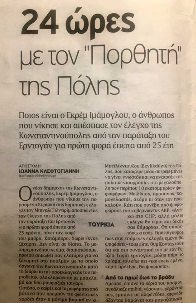İmamoğlu için “İstanbul’u Pontuslu kazandı” başlığını atan Yunan gazeteci: Haberim çarpıtıldı. Ioanna Kleftogianni, “Yunanca’da Pontuslu demek, Karadeniz kıyısından demektir asla İmamoğlu’nun Yunan kökenli olduğunu ima etmedim” dedi. Ethnos açıklama yaptı: Türk medyası kirli seçim oyunlarına gazetemizi alet etmeye çalışıyor