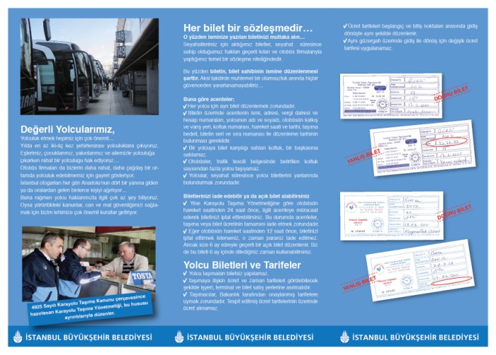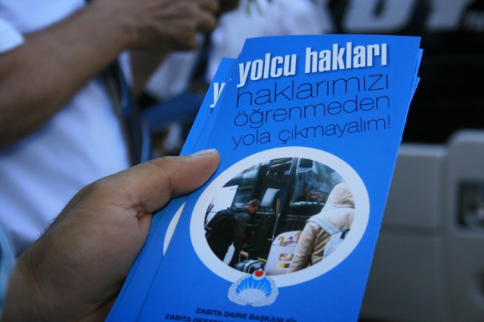"Haklarımızı öğrenmeden yola çıkmayalım" başlıklı broşürde yolculara seyahat bileti alırken dikkat edilmesi gereken hususlar, bilet iade koşulları, fiyat tarifeleri, engelli ve çocuklara yapılması zorunlu indirimler, seyehattaki güvenlik ve sağlık hakları, karayolu taşımacılığında denetim yetkisi olan birimler hakkında bilgiler veriliyor.